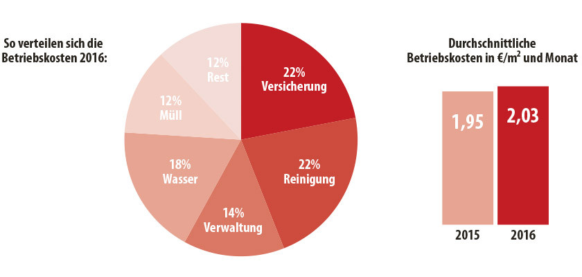 Die Versicherungsprämien sind am stärksten gestiegen. Sie betrugen 2015 noch rund 5,03 Euro/m², 2016 bereits rund 5,46 Euro/m².