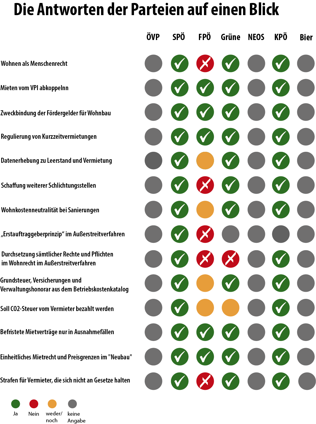 Insgesamt waren 15 Fragen zu beantworten und vier der sieben Parteien haben diese Möglichkeit genutzt. SPÖ, Grüne, FPÖ und KPÖ haben den Fragebogen der Fair Wohnen-Redaktion zum Thema Wohnen beantwortet und ihre wohnungspolitischen Positionen dargelegt. Dabei fällt auf, dass in vielen Punkten Einigkeit herrscht und der von den wohnpolitischen Experten der Mietervereinigung erarbeitete Forderungskatalog auf große Zustimmung stößt. Keine Antwort von ÖVP, NEOS und Bierpartei Von ÖVP und NEOS gab es bis Redaktionsschluss keine Antwort. Die Bierpartei ließ uns wissen, dass »derzeit die Ressourcen fehlen alle Anfragen zu beantworten.« Für die Interessen von Mietern hat man bei der Bierpartei offenbar keine Zeit. Wohnpolitische Antworten bleibt die Truppe Ihnen, liebe Leser, also schuldig. Auch die ÖVP und die NEOS blieben alle Antworten schuldig. Das mag Ihnen, liebe Leser, vielleicht als Hinweis dienen, welche Rolle Ihren berechtigten Interessen als Mieter dort gegeben wird und was Sie diesbezüglich nach der Wahl von diesen Parteien zu erwarten haben.