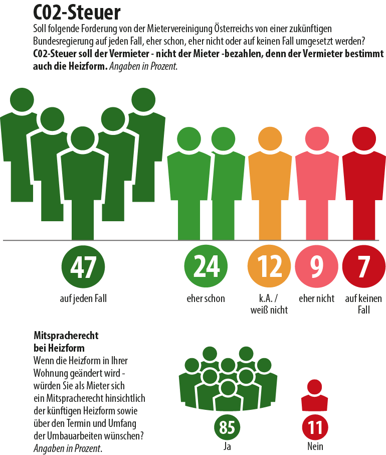 Mitten in der Teuerungskrise, im Juli 2022, als Mieten und Energiepreise durch die Decke gingen, hat die Bundesregierung mit der CO2-Steuer Mieterinnen und Mieter zusätzlich belastet. Die CO2-Steuer bleibt ohne Lenkungseffekt, denn: Mieterinnen und Mieter haben keine Möglichkeit, das Heizsystem in einem Mehrparteienhaus zu ändern. »Es ist ungerecht und klimapolitisch verfehlt, dass der CO2-Preis für den Betrieb dieser Heizungen den Mieterinnen und Mietern aufgebürdet wird«, sagt Hanel-Torsch. Die Forderung der Mietervereinigung lautet daher: Die CO2- Steuer soll derjenige zahlen, der die Heizform – und damit den CO2-Ausstoß – bestimmt. 47 Prozent der Wienerinnen und Wiener stimmen dieser Forderung »auf jeden Fall« zu, weitere 24 Prozent »eher schon«. In Summe stehen damit 71 Prozent dem Vorschlag der Mietervereinigung positiv gegenüber.