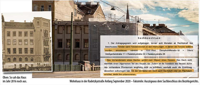 Links: So sah das Haus im Jahr 2016 noch aus. Rechts: Wohnhaus in der Radetzkystraße Anfang September 2020 – Faksimile: Auszüge aus dem Sachbeschluss des Bezirksgerichts.